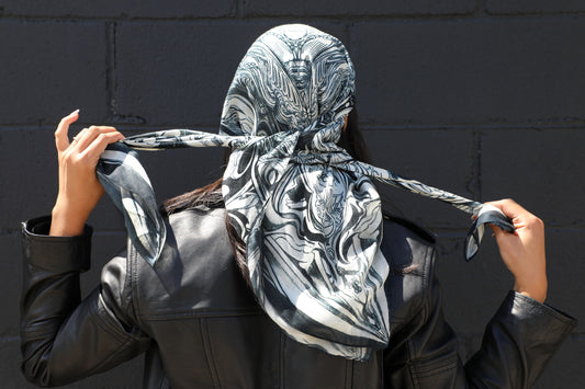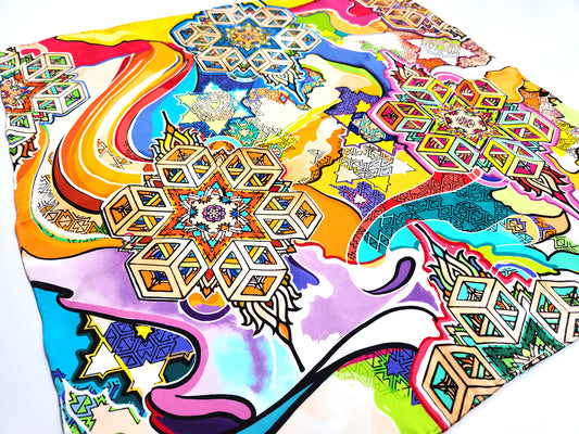 The collection explores the power of finding balance and harmony in a world of duality. The scarves are mystical in nature, unapologetically psychedelic, and evoke the liquid and ethereal. The movement in each design taps into subtle wavelengths to enhance the energy patterns within each of us.