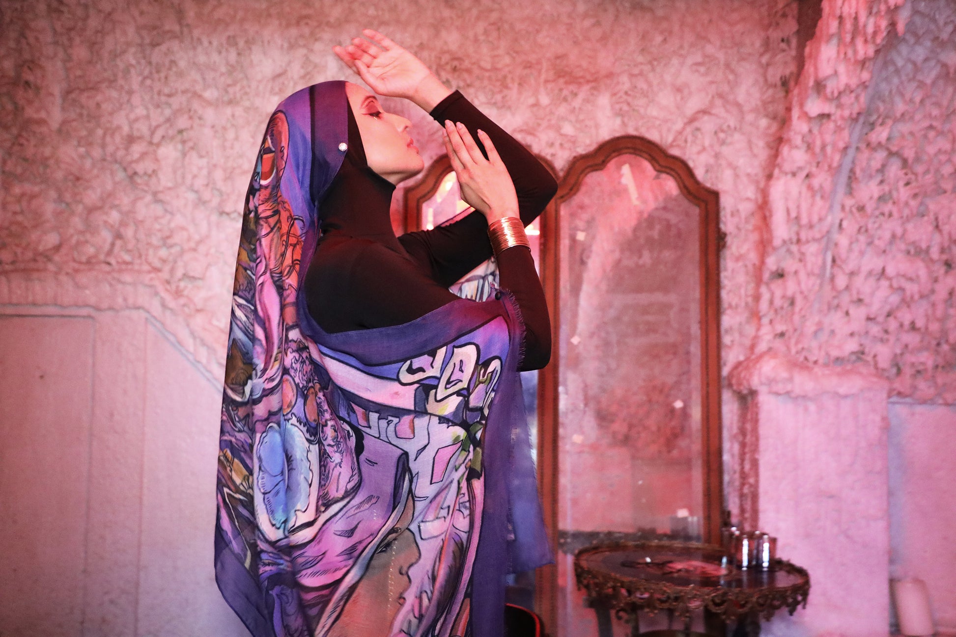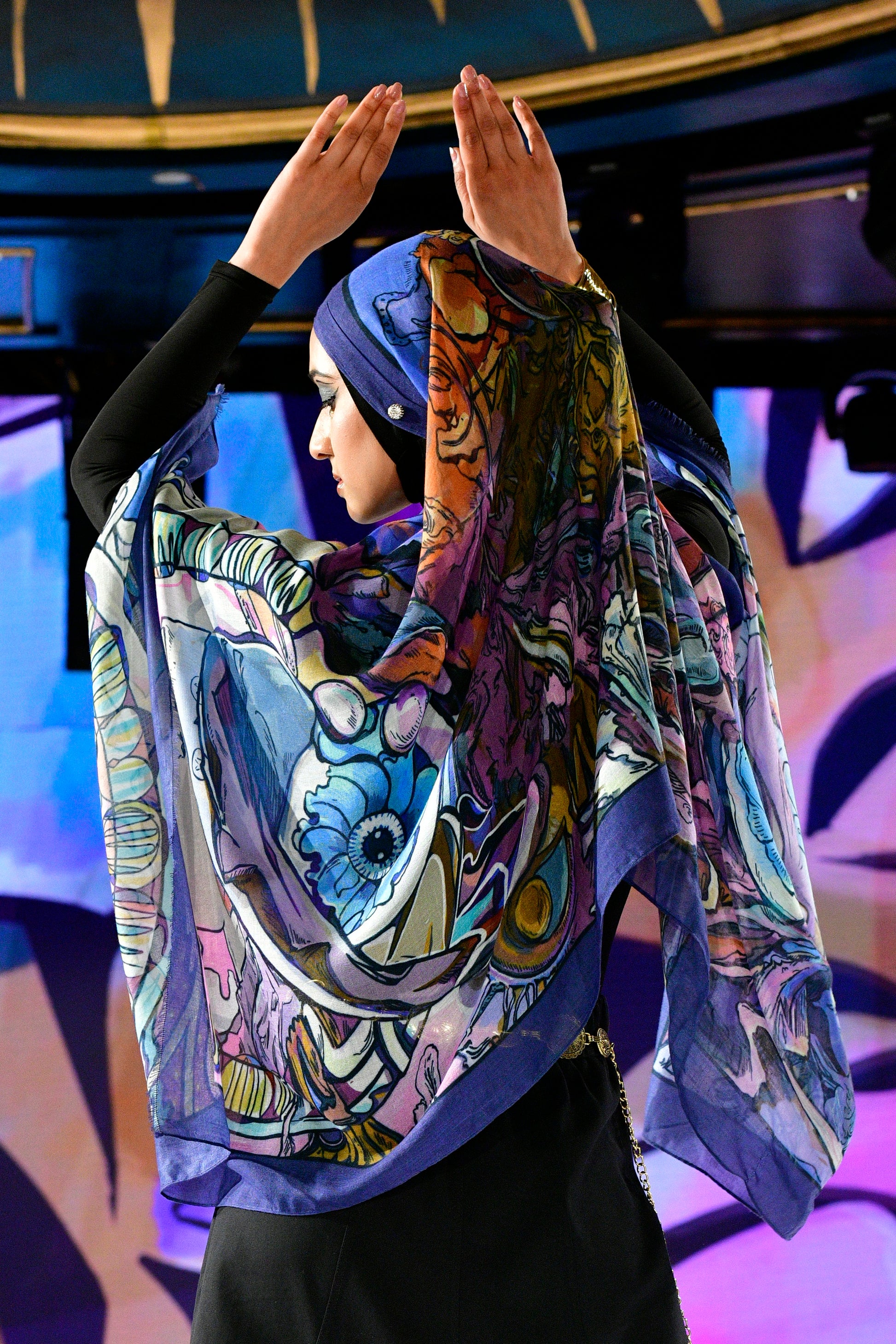 The Sisterhood scarf shows two women at the opposite ends of a chaotic world are tied together by their shared headcoverings.