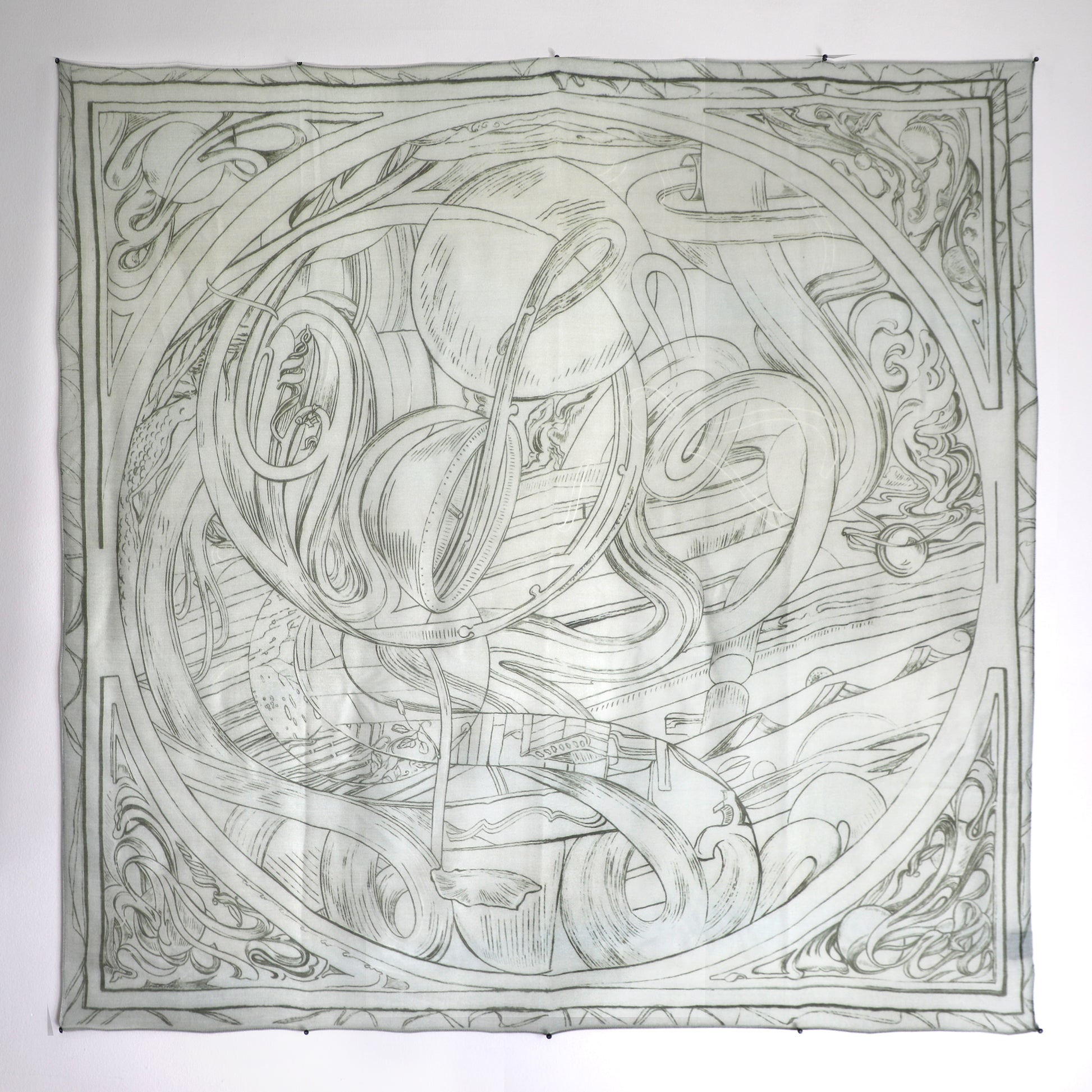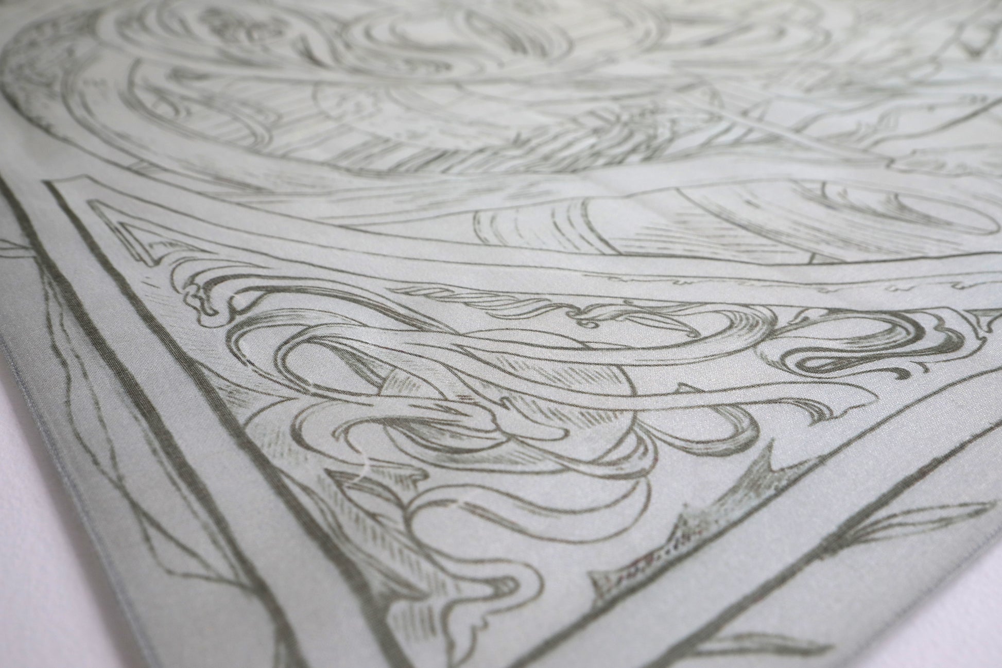 The Worlds scarf is an ode to the phases of transformation we experience in life. Its design overlays a classic illustrated map with a deconstructed portion of the tree of life.